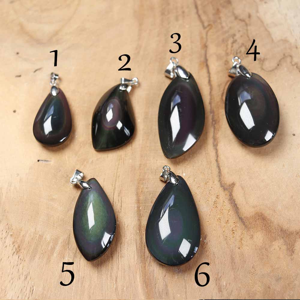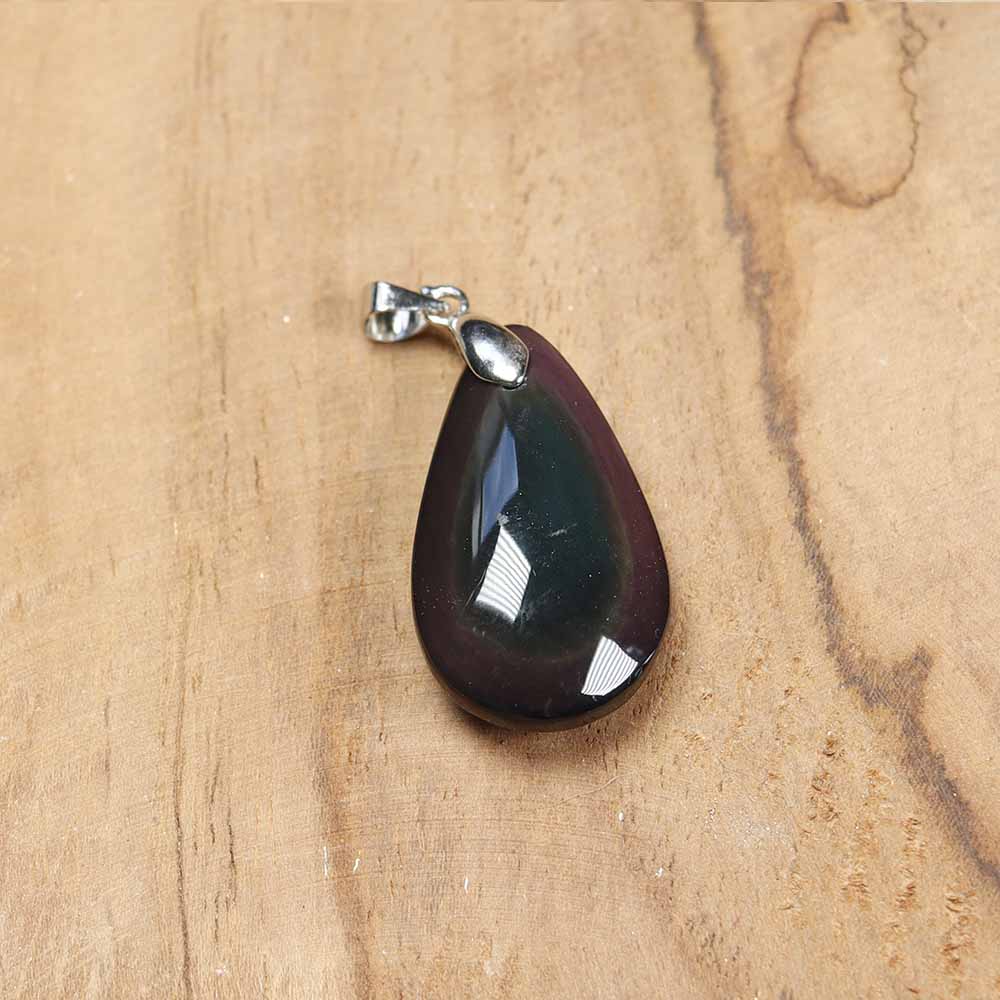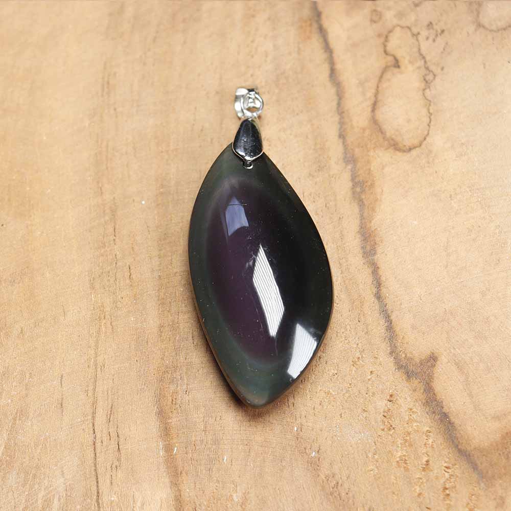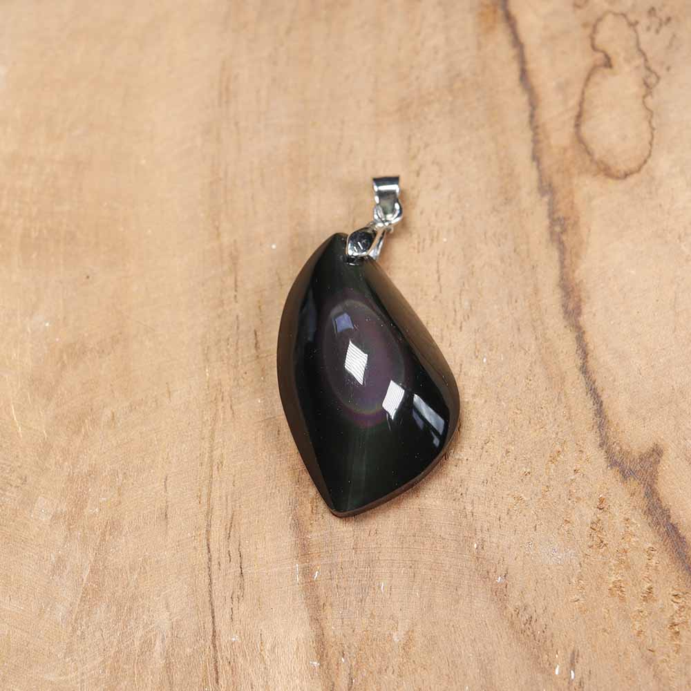 L’obsidienne est une pierre de formation volcanique, créée à partir de la lave des volcans. Se présentant souvent de couleur noire, l’obsidienne se décline en différentes variétés. Ici, je vous propose des pendentifs en obsidienne œil céleste, variété qui présente des irisations de surface bleues ou vertes.